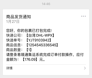 等待仓库那边将货物打包并审核运费之后,微信公众号会发送付款消息提醒,用户可以对订单进行付款操作。