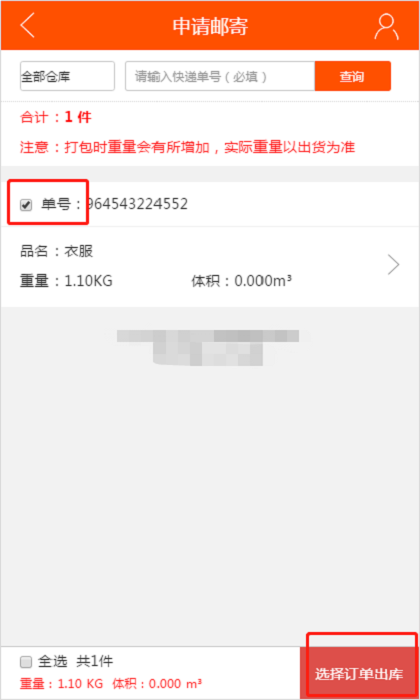 当包裹货物到达仓库时后,会员可以收到货物入库的公众号消息通知,可以进行申请邮寄,勾选需要打包的订单申请出库。