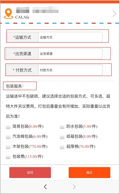 收货地址选择之后,点击选择【运输方式】、【出货渠道】和【付款方式】,勾选所需要的包装服务。一定要记得点击勾选【我已看过并接受服务协议】,确定无误后点击【确认】即可。