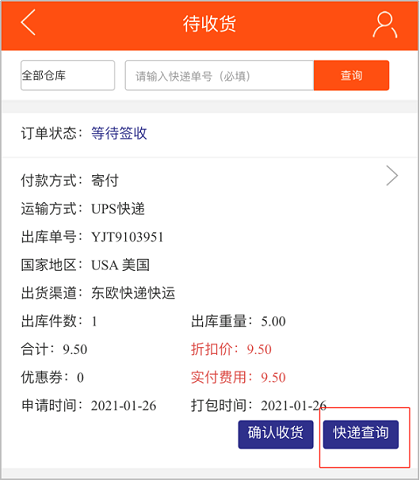 此时包裹状态可以在【确认收货】列表看到,点击进去可以查询物流轨迹。等待货物收到之后,签收即可。
